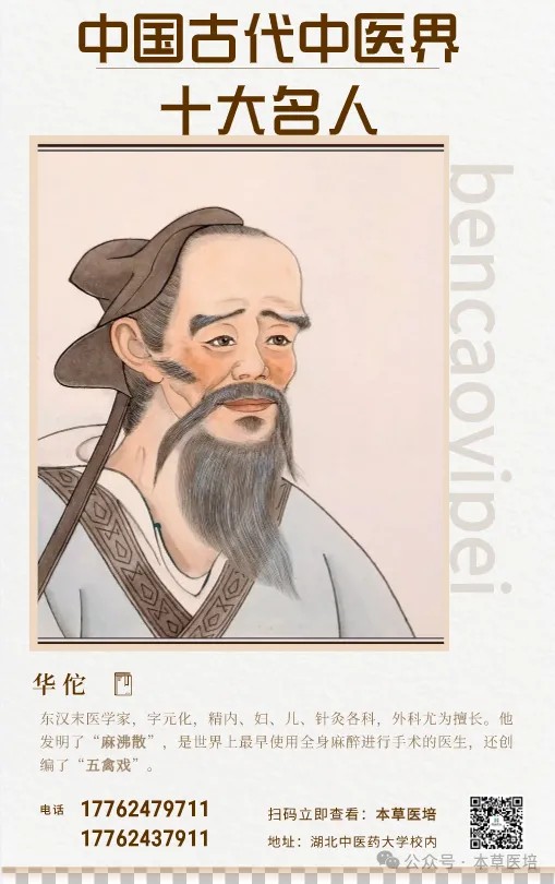 东汉末年著名医学家,精通内、外、妇、儿、针灸各科,尤其擅长外科。他发明了世界上最早的麻醉剂“麻沸散”,开创全身麻醉手术的先河,还创编了“五禽戏”,将养生与运动相结合。